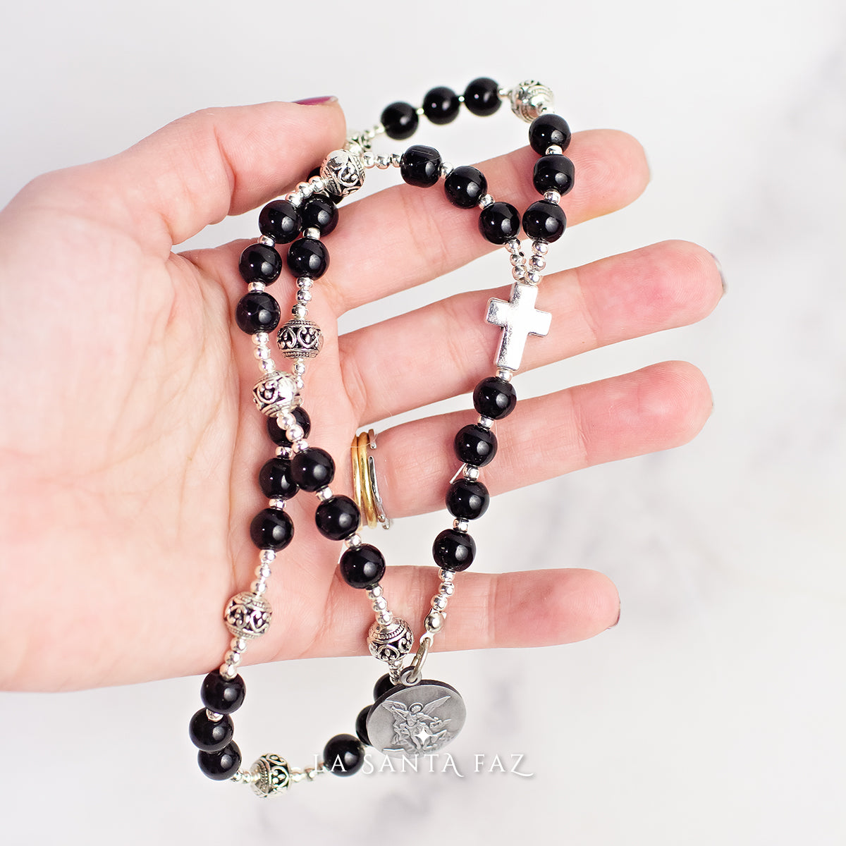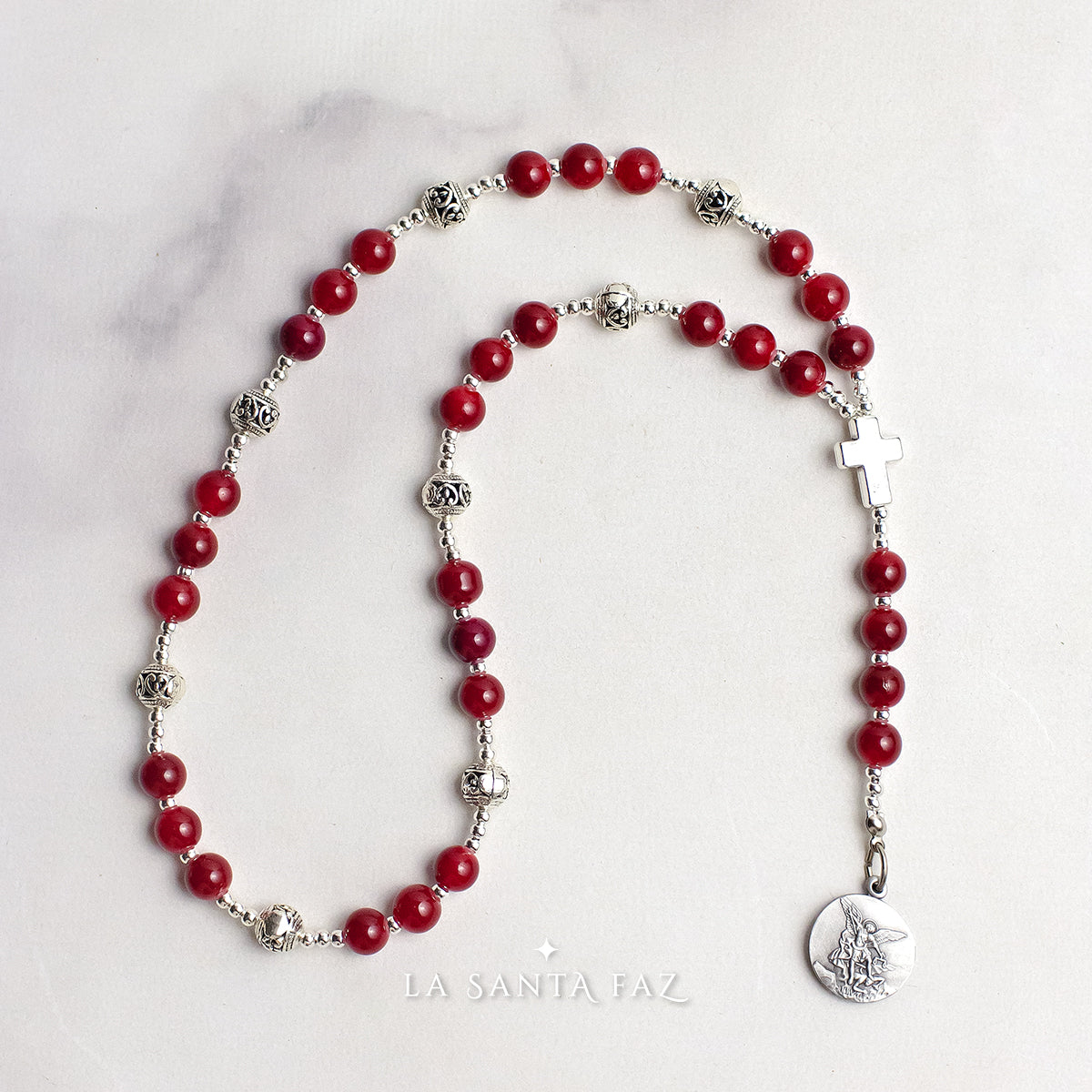 Coronilla de San Miguel Arcángel, confeccionada artesanalmente con cuentas de vidrio en dos colores, una cruz en el centro y la medalla de San Miguel Arcángel. Tiene 32 cm de largo total. Incluye un folleto con las oraciones para rezarla.