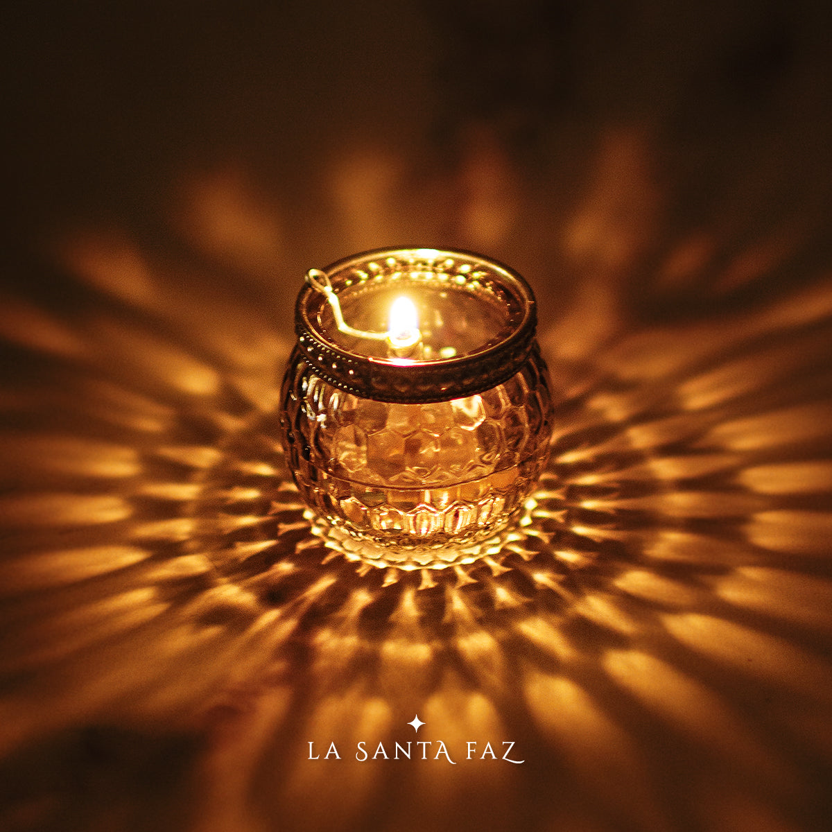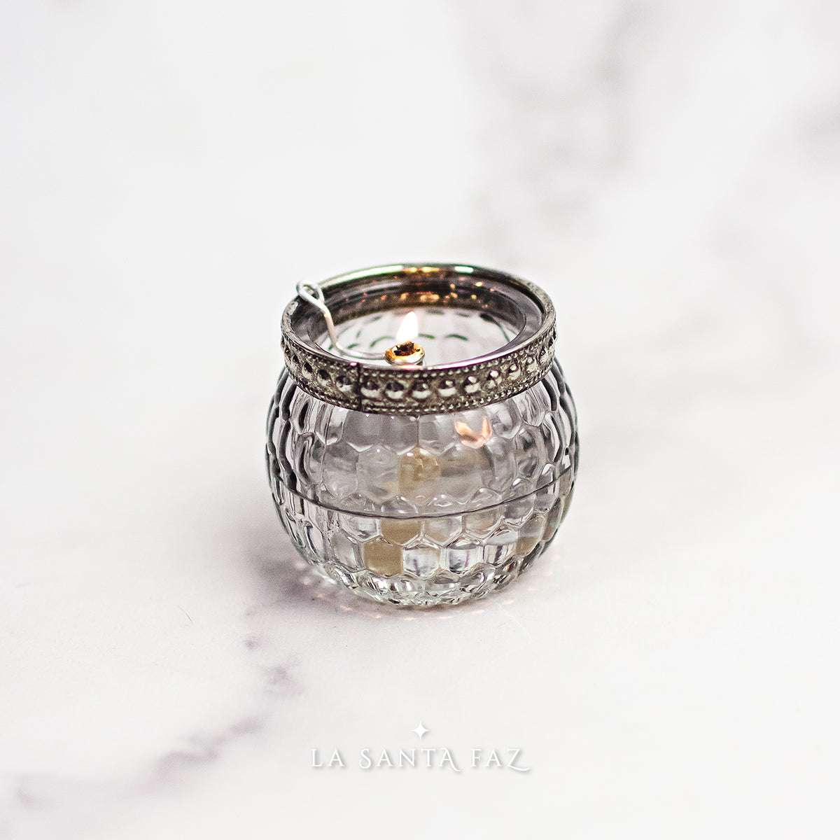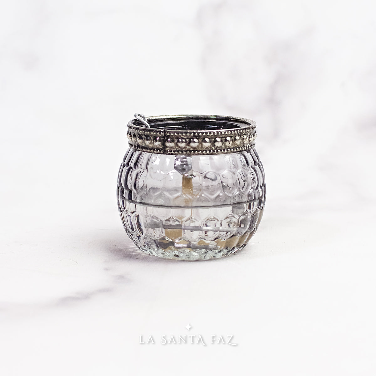 Lámpara votiva de vidrio gris labrada, que genera hermosos destellos de luz. Incluye un mechero con una mecha de algodón.