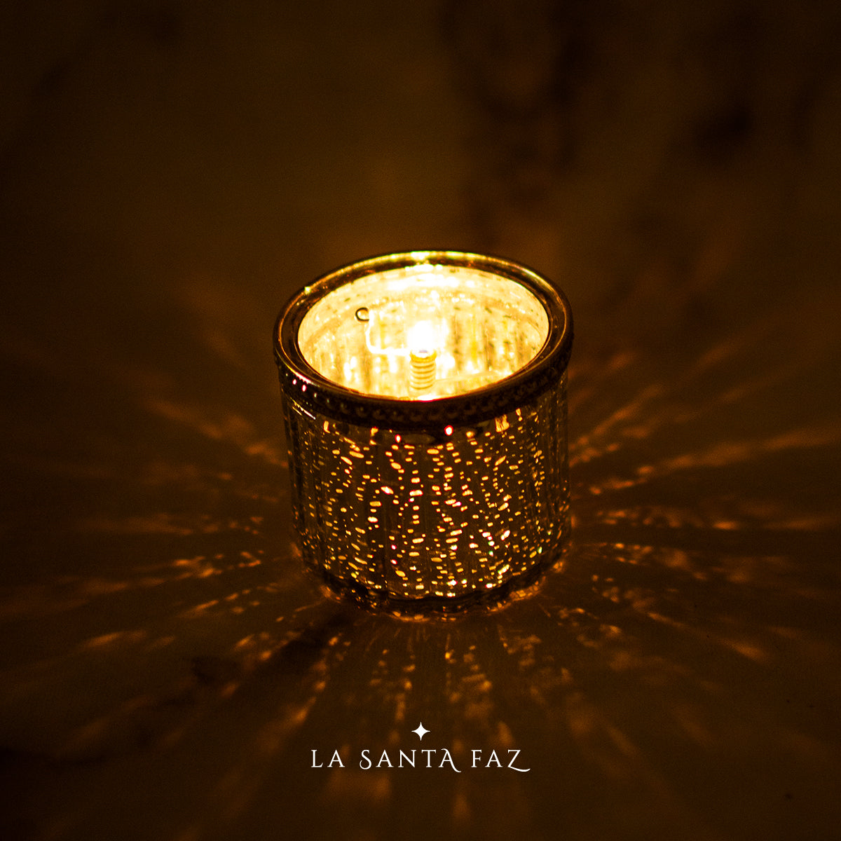 Lámpara votiva de vidrio mercurizado grande, que genera hermosos destellos de luz. Incluye un mechero con una mecha de algodón.