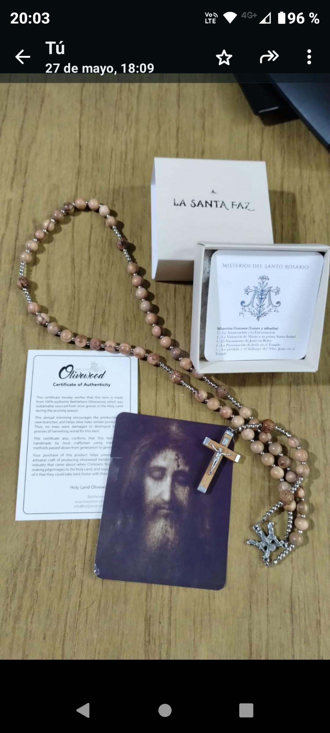 Recibí el pedido todo es muy muy lindo. El Rosario de madera de olivo no se aprecia tanto en la foto es mucho más bello cuando lo recibís 🤗🙏🏻y las imágenes son hermosas!