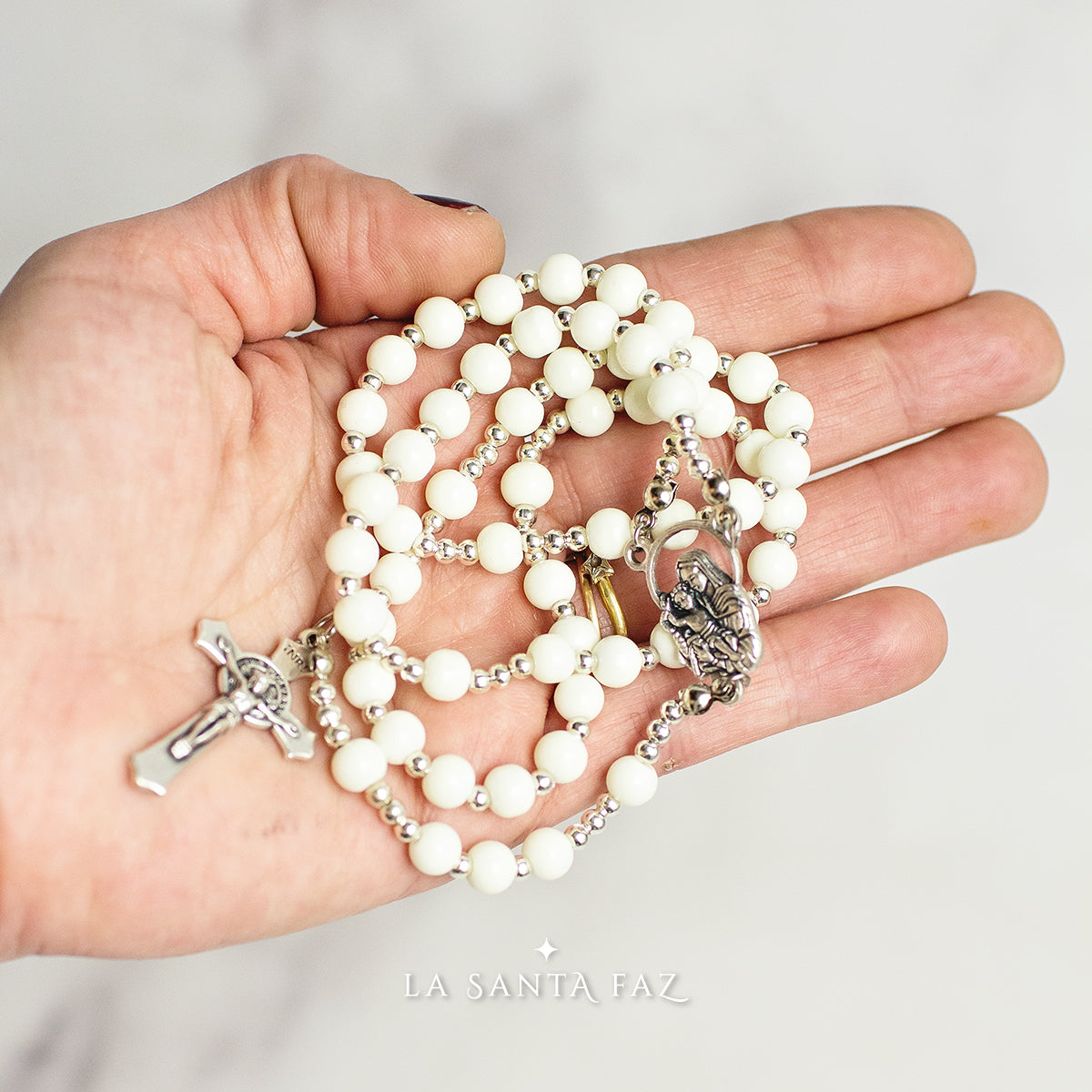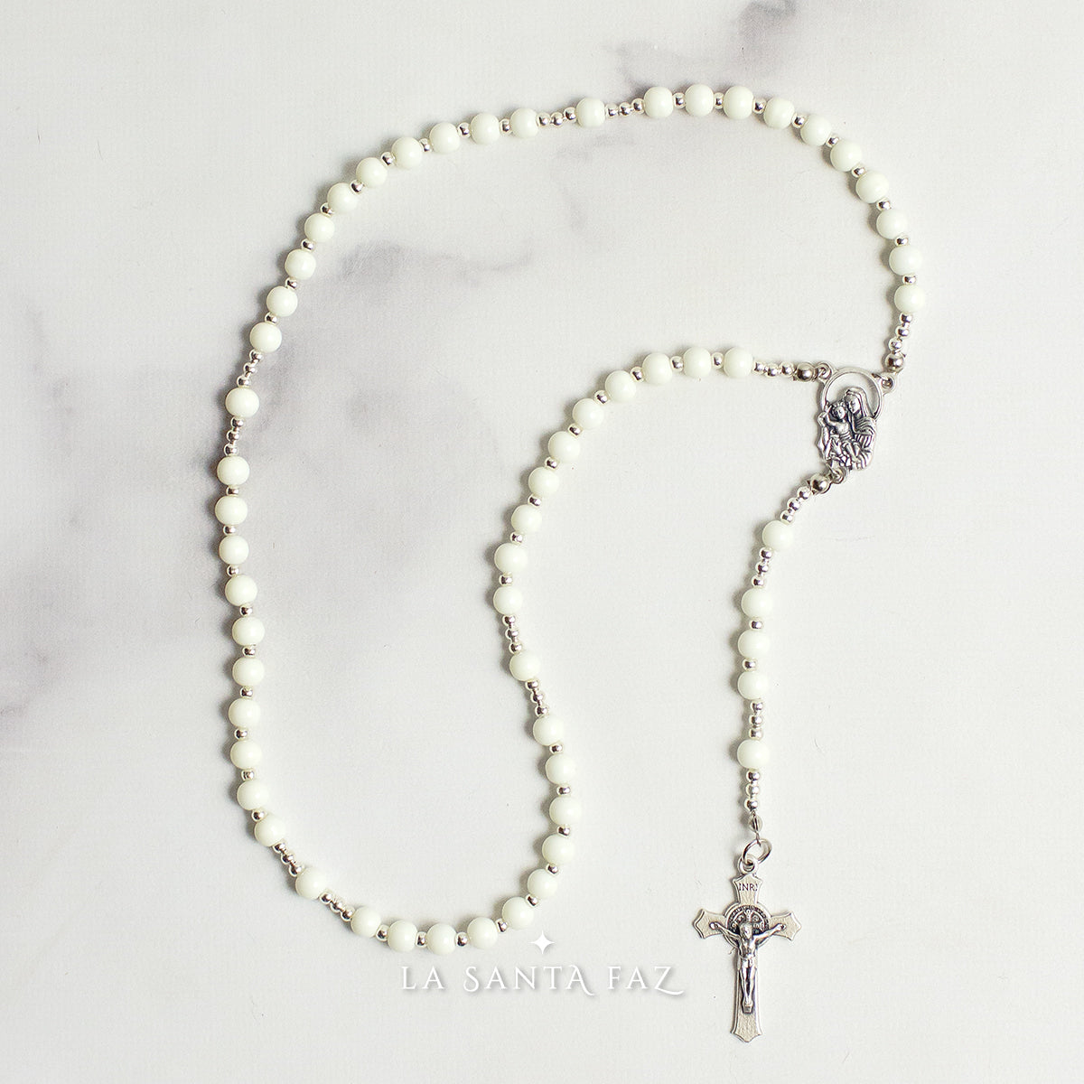 Santo Rosario con cuentas de vidrio blancas opacas, en el centro tiene una medalla de la Virgen con el Niño y la cruz de San Benito.