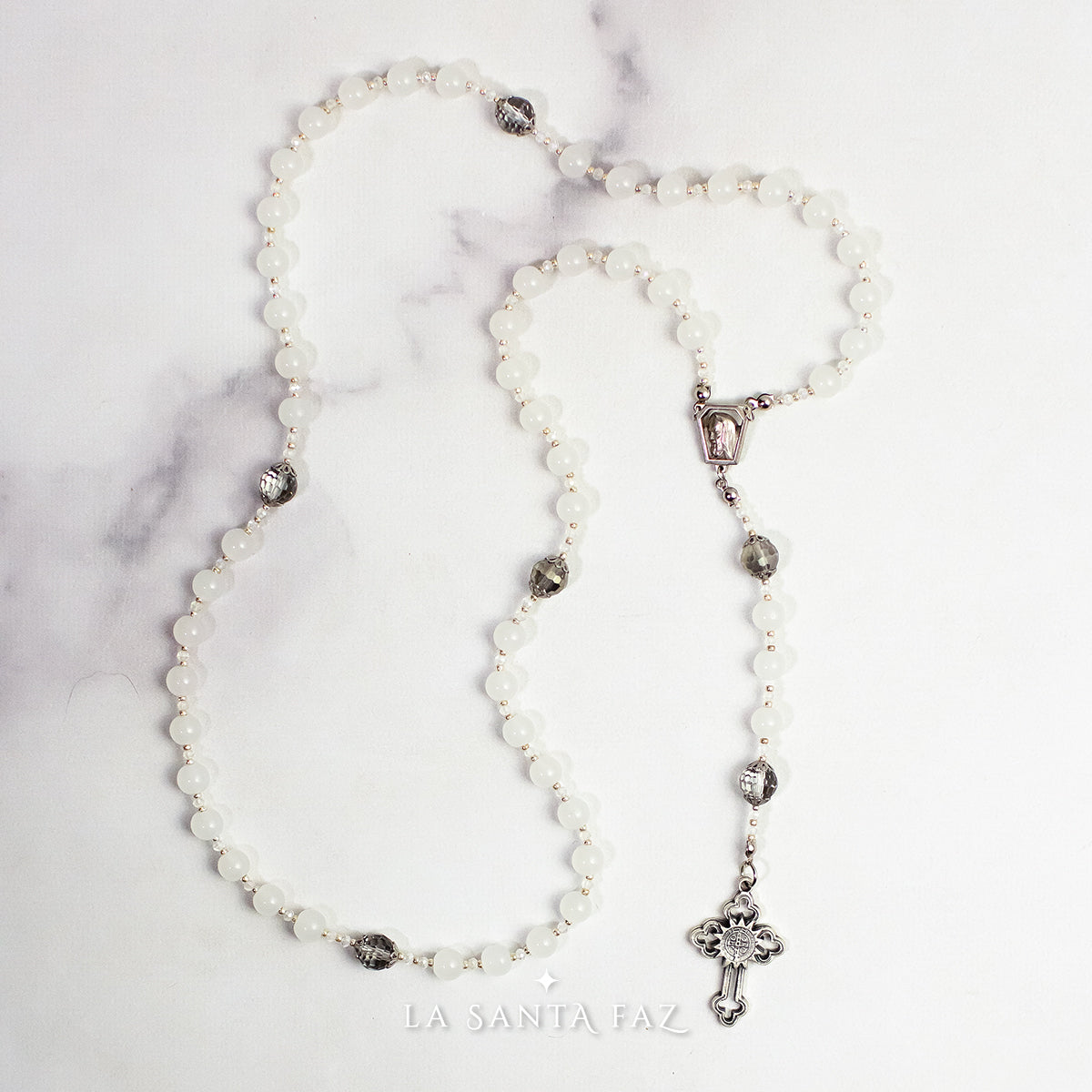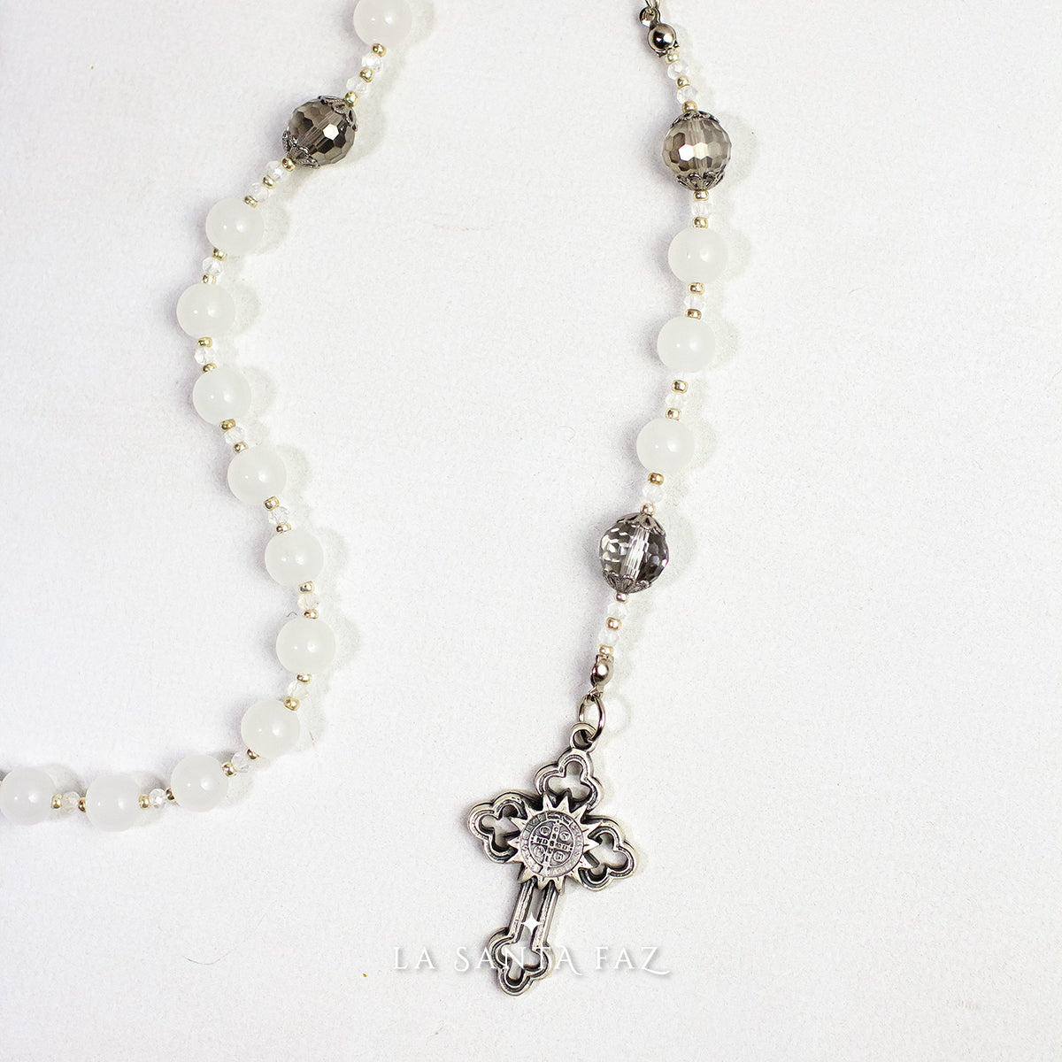 Santo Rosario confeccionado con cuentas de vidrio y cristales. Como pieza central tiene a una imagen del Padre Pío y una cruz de San Benito. Mide 50 cm de largo de punta a punta y puede usarse como collar.