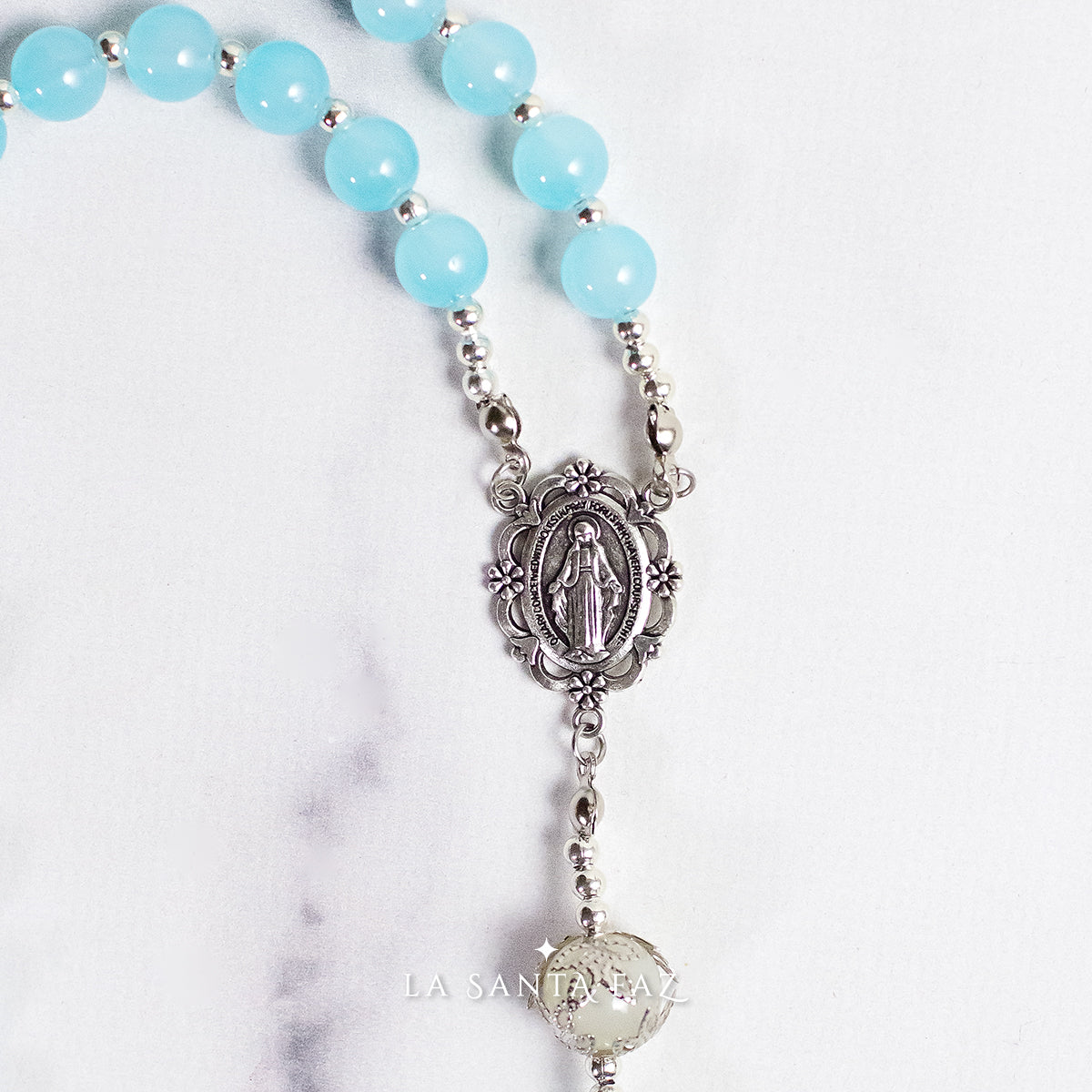 Santo Rosario con cuentas de vidrio, en el centro tiene una medalla de la Virgen de la Medalla Milagrosa terminando con una cruz italiana de estilo.
